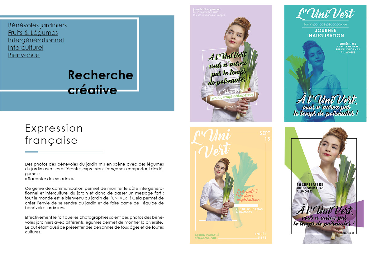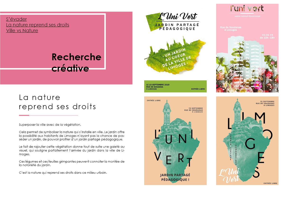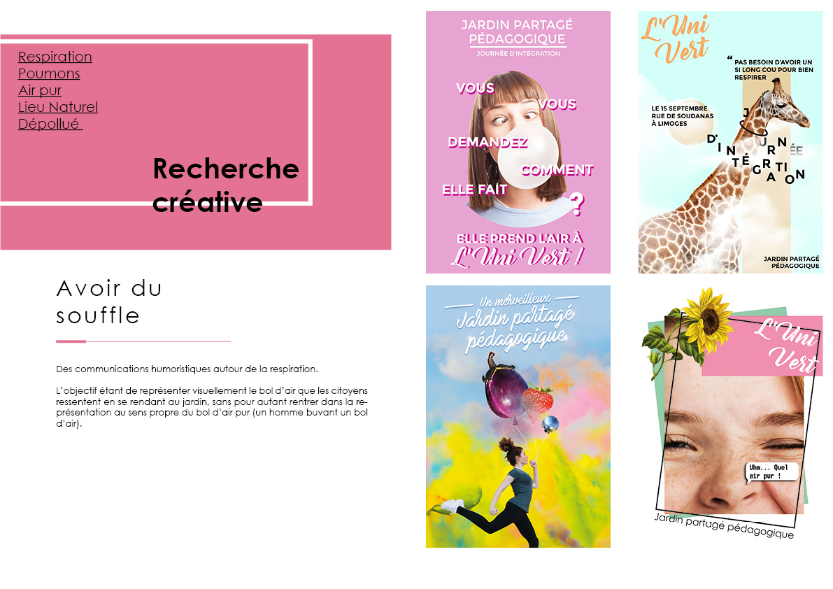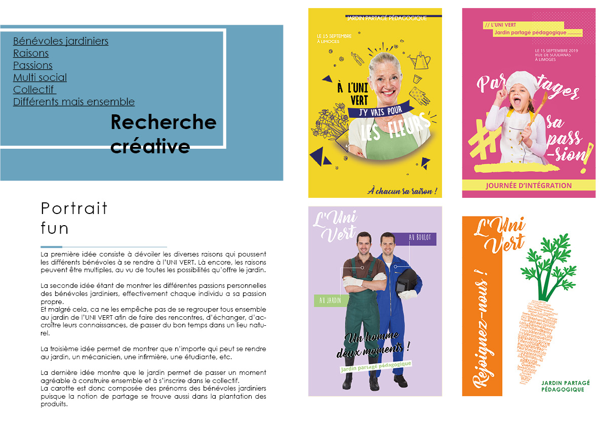 C’est un projet fictif complet avec la création du cahier des charges, puis la rédaction d’une stratégie de communication. Il a été suivi de recherches créatives graphiques et il a abouti sur le développement créatif. Ce projet a été conclu par un oral devant un jury en fin d’année.